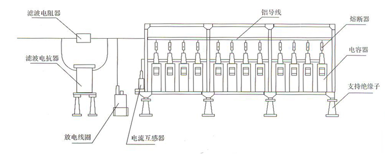 本装置由滤波电容器组、空芯电抗器、开关(隔离开关、接地开关、断路器等)、避雷器、熔断器、电流互感器、放电线圈、电阻器及绝缘子、框架等组成。(装置中根据用户要求电器元件有所增减,均符合相应的标准)
